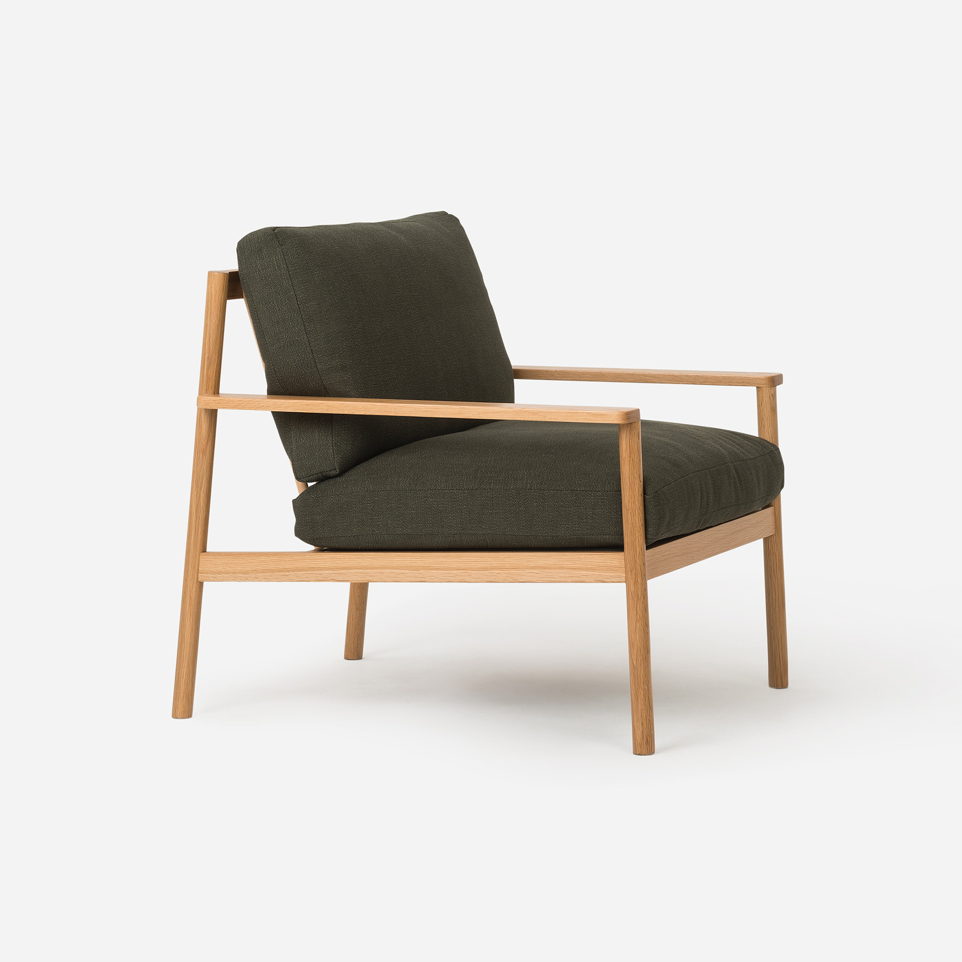 The Daily Armchair balance of classic yet modern design. It takes inspiration from mid-century style, combined with a timeless aesthetic to meet today’s needs and seamlessly integrate into all living spaces. The solid wooden frame is made with American oak and features a series of intersecting dowels and boards. These intersections create interesting joins and negative details throughout the chair. This detail is most prominent in the backrest where the dowels create a stunning series of repetitive junctions, making the chair as beautiful from the back as it is from the side or front.